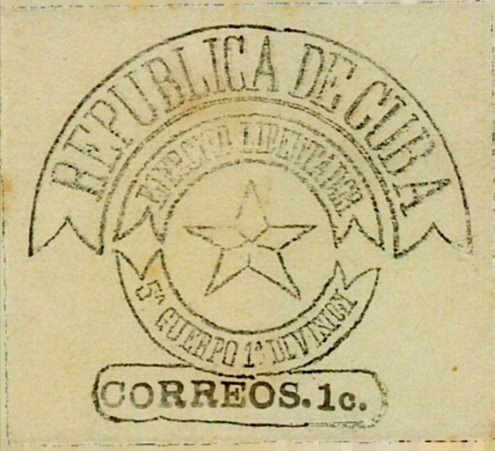 Hace algunos años tuve la oportunidad de examinar, en la colección de un filatelista norteamericano, varios recortes de papel que mostraban impresiones realizadas mediante gomígrafo en distintos colores, atribuidas a la Primera División del Quinto Cuerpo del Ejército Libertador, que operaba en la región de Matanzas. El gomígrafo tenia en el recuadro inferior un espacio libre para  añadir el valor.